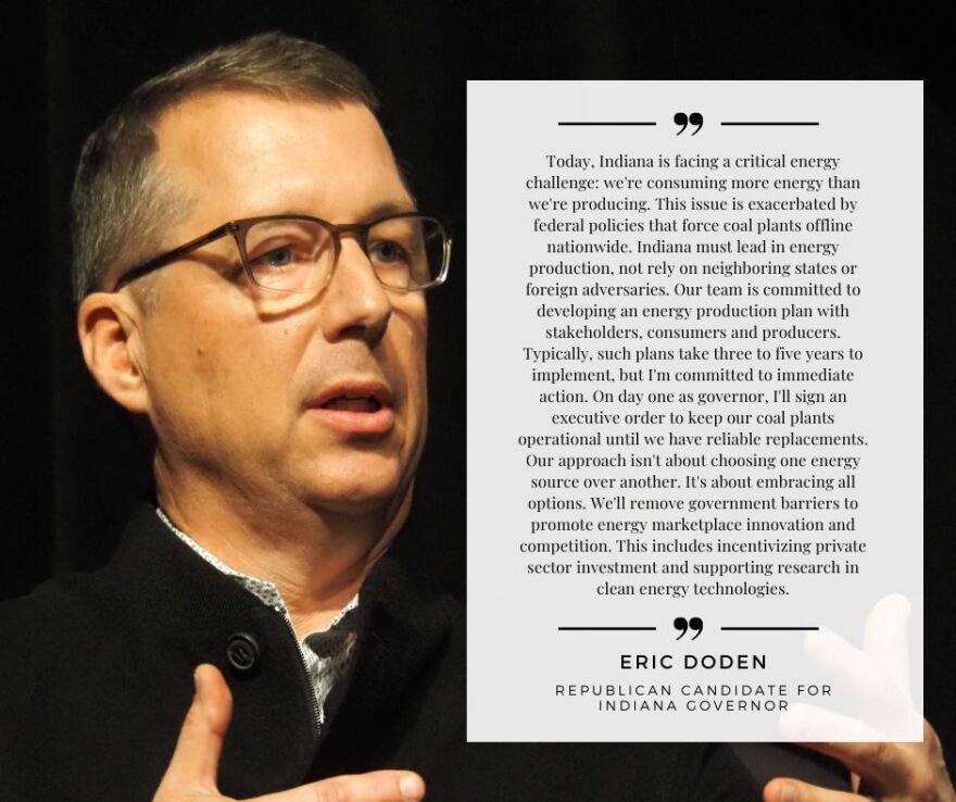- Doden: Our next governor’s focus should be to make sure Hoosiers have affordable, reliable and available energy. Right now, that means natural gas and coal. If we don’t, we’ll continue to be at a disadvantage to other states and global adversaries like China. Indiana uses more energy than it produces. This is a problem because we must buy power off the national grid that can be up to seven times more expensive than we produce at home. We need to start working on this now, but it’s going to take years to get done. That’s why on day one, I will sign an executive order to keep our coal plants open, generating power, until the market supports a reliable and affordable replacement. At the end of the day, I’ll support any energy source that keeps costs low and the lights on for homeowners and businesses. Our strategy prioritizes a diverse energy portfolio, energy efficiency, and market-driven solutions, ensuring Hoosiers have reliable and affordable energy now and in the future.