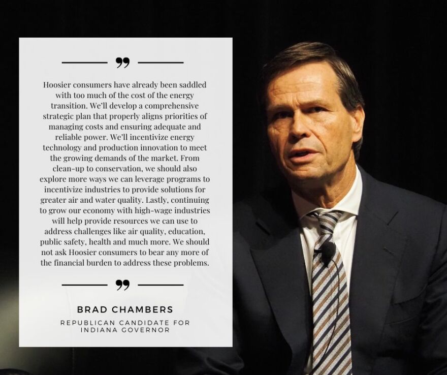 - Chambers: Indiana is facing two impending energy challenges: costs that have risen out of control and a supply base that will need to grow to meet increased demand because of population and industry growth. We’ll create a strategic plan and incentivize energy technology and production innovation for all sources of power, including wind, solar, natural gas, coal, hydrogen, and nuclear. As we develop new energy technologies, we have to mitigate rate increases that devastate Hoosier families and hurt our economic competitiveness. To avoid continued rising costs, we will push back against EPA pressure for premature closure of Indiana’s coal-fired power plants. We’ll work with utilities to create a credible plan for building and financing natural gas-fired power plants capable of producing at least 5 GW of new electric power over the next five years and we’ll continue to support the innovation at the Midwest Hydrogen Hub in Northwest Indiana.