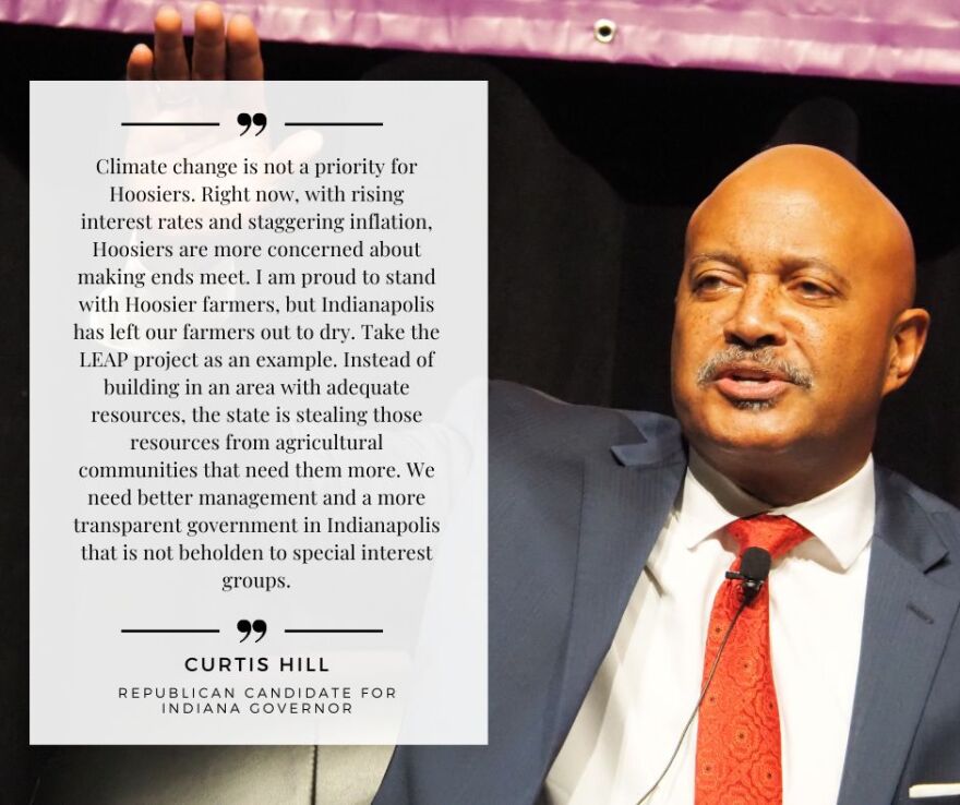 - Hill: Big government carbon capture policies are hurting Hoosier farmers and businesses. If we want to encourage sustainable environmental practices, we need to cut the overbearing regulation that Indianapolis has placed on businesses throughout our state. While Hoosier consumers are struggling to make ends meet with rising costs of goods and services, the last thing our government needs to be doing is intentionally forcing businesses to raise their costs. Our administration will never succumb to radical energy policies adopted by progressive Democrats, and we will always put the needs of consumers, farmers, and businesses first.