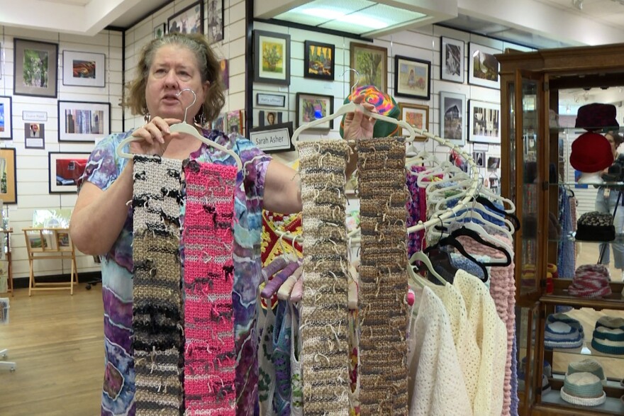 Volunteers, including Asher, run the gallery. Asher also sells her work in the store: crocheted and knitted tops and scarves. The gallery hosts music performances and arts and crafts events to get more people in the store and looking at the art, which also brings in more revenue. She is hopeful for the future of the business.